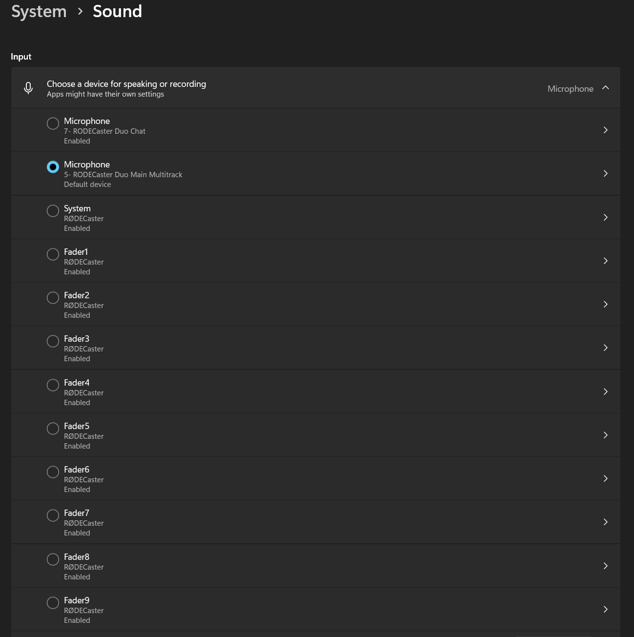 When the RØDECaster Virtual Devices Driver connects to the RØDECaster Pro II / Duo, the USB 1 Multitrack Output will be expanded to provide the individual faders as separate input options on your computer.