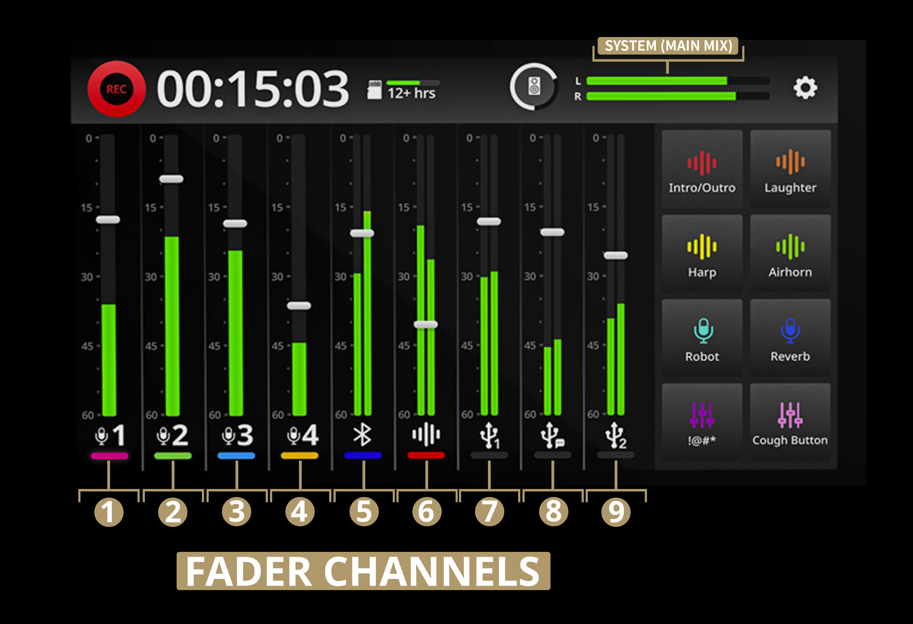 With these inputs available, you will be able to select any of the RØDECaster's channels from faders 1 to 9 within your recording or streaming software alongside the Main Stereo Mix, regardless of what is currently assigned to the fader. This allows all channel types to be available as individual inputs on a computer.