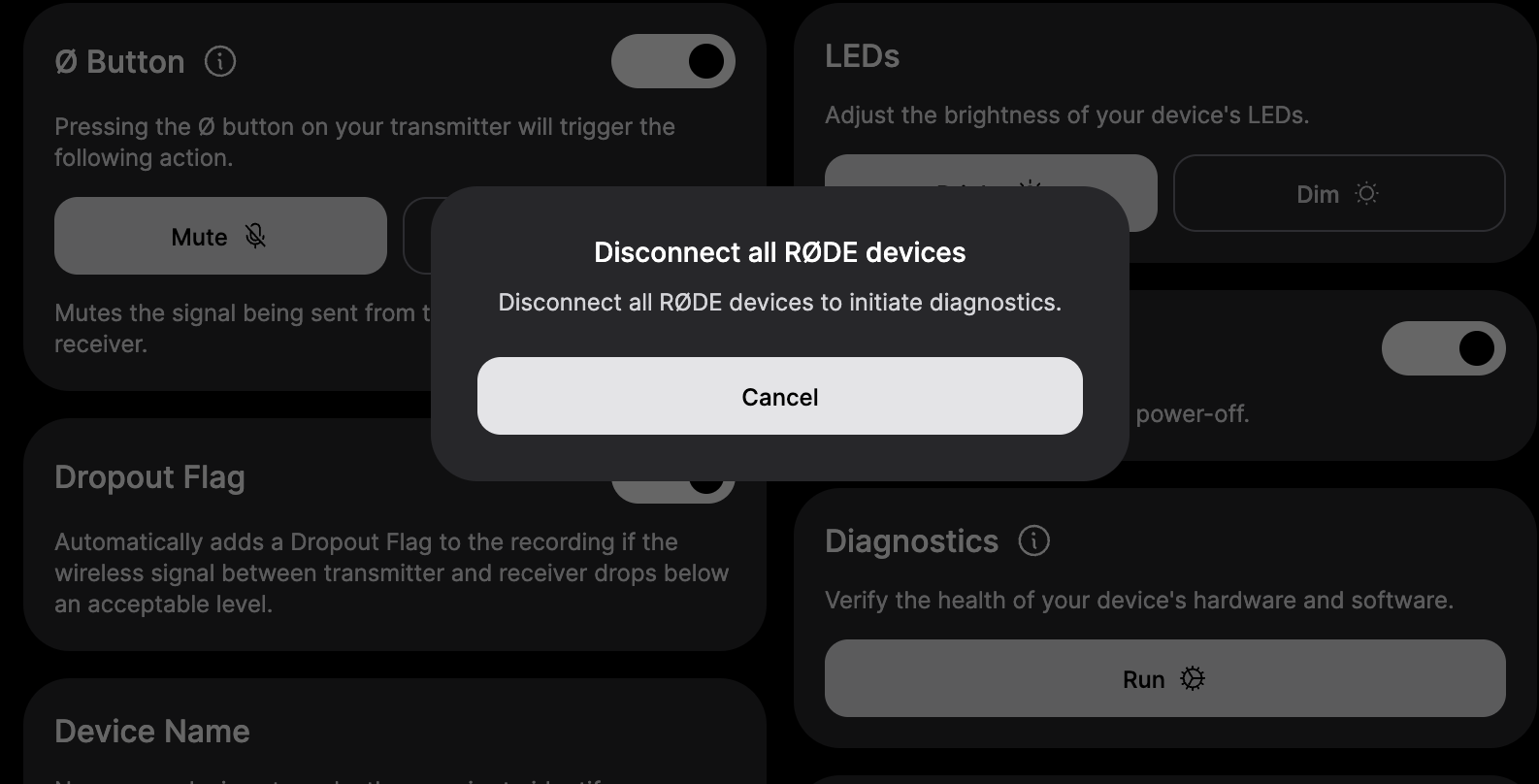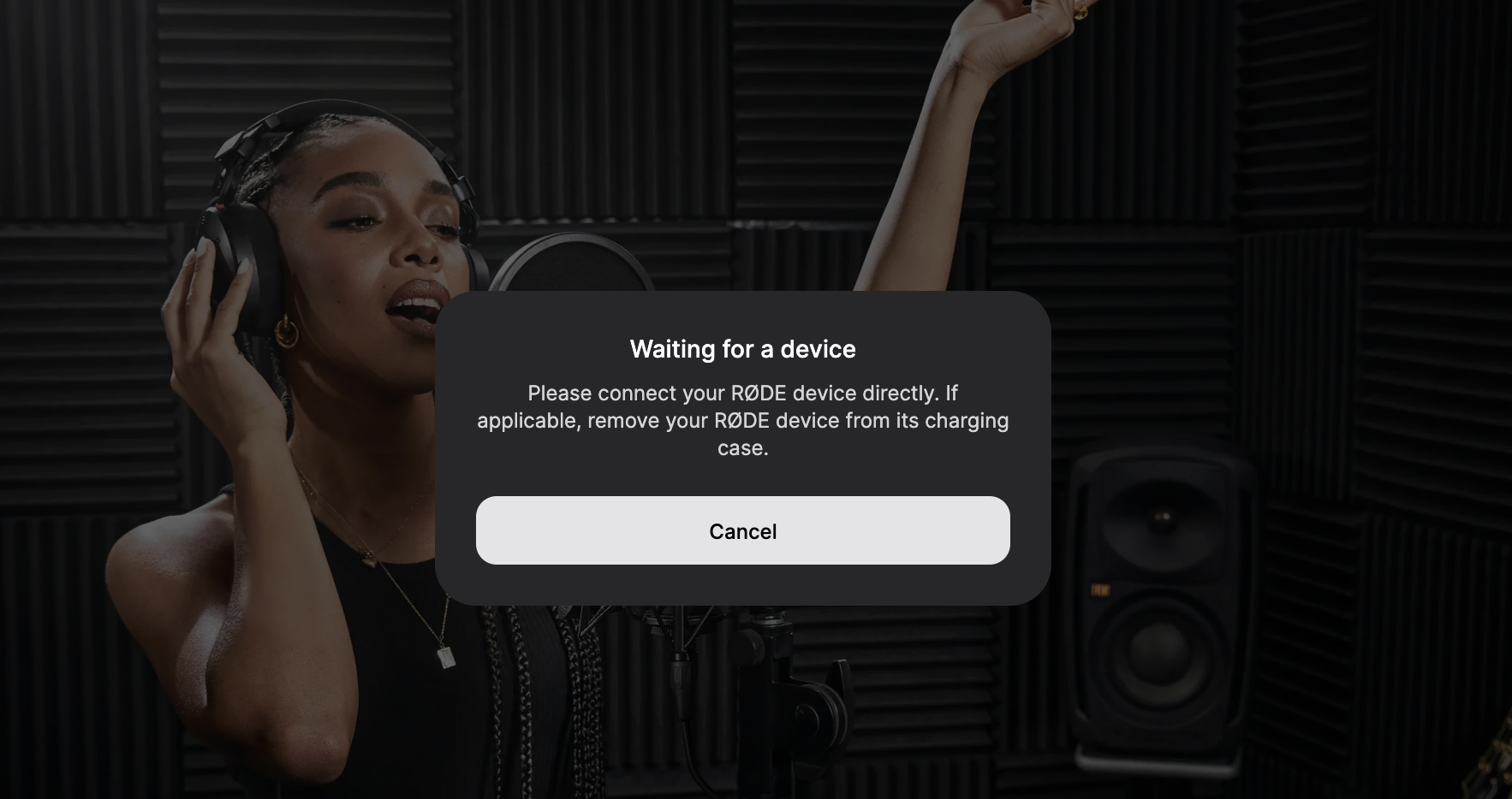 Cuando veas este mensaje, desconecta suavemente el extremo del cable USB que está conectado actualmente a tu dispositivo RØDE por un breve momento. Después de cable, deberías notar que la siguiente indicación aparece en tu pantalla.