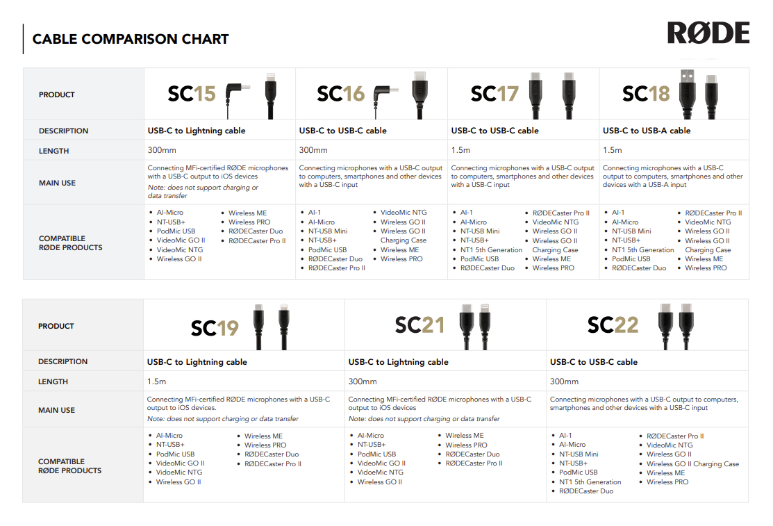 Con la amplia variedad dentro de la gama de cables RØDE, puede resultar complicado distinguir las diferencias entre cada cable y las funciones que tienen. Afortunadamente, contamos con una tabla comparativa completa que muestra claramente las diferencias entre todos los productos de cables RØDE.